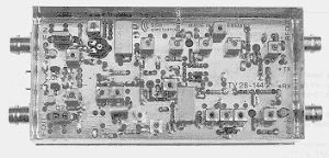 ![]() | The CTM-1 5760 MHz. transmit up converter covers MHz. with a corresponding IF input of MHz. It requires a LO input of 7 mW (available from the CRM-1) and features an active GaAsFET mixer plus three stages of linear amplification. To insure a clean output, silver plated cavity resonators are used between each stage. Unwanted products are more than 40 dB down. Due to its broadband input matching, the CTM-1 is also suitable for digital microwave links and TV applications. An internally adjustable attenuator is provided to accomodate drive levels from 20mW ... 3 Watts for a minimum of 175 mW of linear output. This unit is constructed on a teflon pc board and is housed in an RF tight plated enclosure. 13.8VDC...Dimensions 74 x 111 x 30 mm...Connectors: 3 SMA |