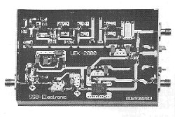 The UEK-2000S 2304 MHz. down converter features: a hempt front-end, 2 pole helical filtes, a GaAsFET second stage preamplifier plus a Schottly double balanced mixer (DBM) yielding a NF <0.8dB. and 20 dB of conversion gain. A +10dBm output is provided at 2160 MHz. for TX mixer operation. 144 MHz.-IF, 3 SMA connectors and 13.8 VDC operation.
