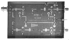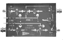 The XRM- GHz. Down converter covers GHz. with a corresponding IF output of MHz. This module features a two stage GaAsFET preamplifier, silver plated cavitiy filters for image rejection, and an active GaAsFET mixer. With this configuration, a NF of <2.2dB and a conversion gain of 20dB is obtained. The CRM also contains two cavity coupled stages to multiply the 2556 MHz. LO signal to the mixer injection frequency of 10.224 GHz. A separate port is also provided with a +7dBm output at 10.224 GHz. for transmitter mixer operation. This unit is constructed on a teflon pc board and is housed in an RF tight plated enclosure. 13.8VDC ... Dimensions 74 x 111 x 30 mm ... Connectors: 4 SMA